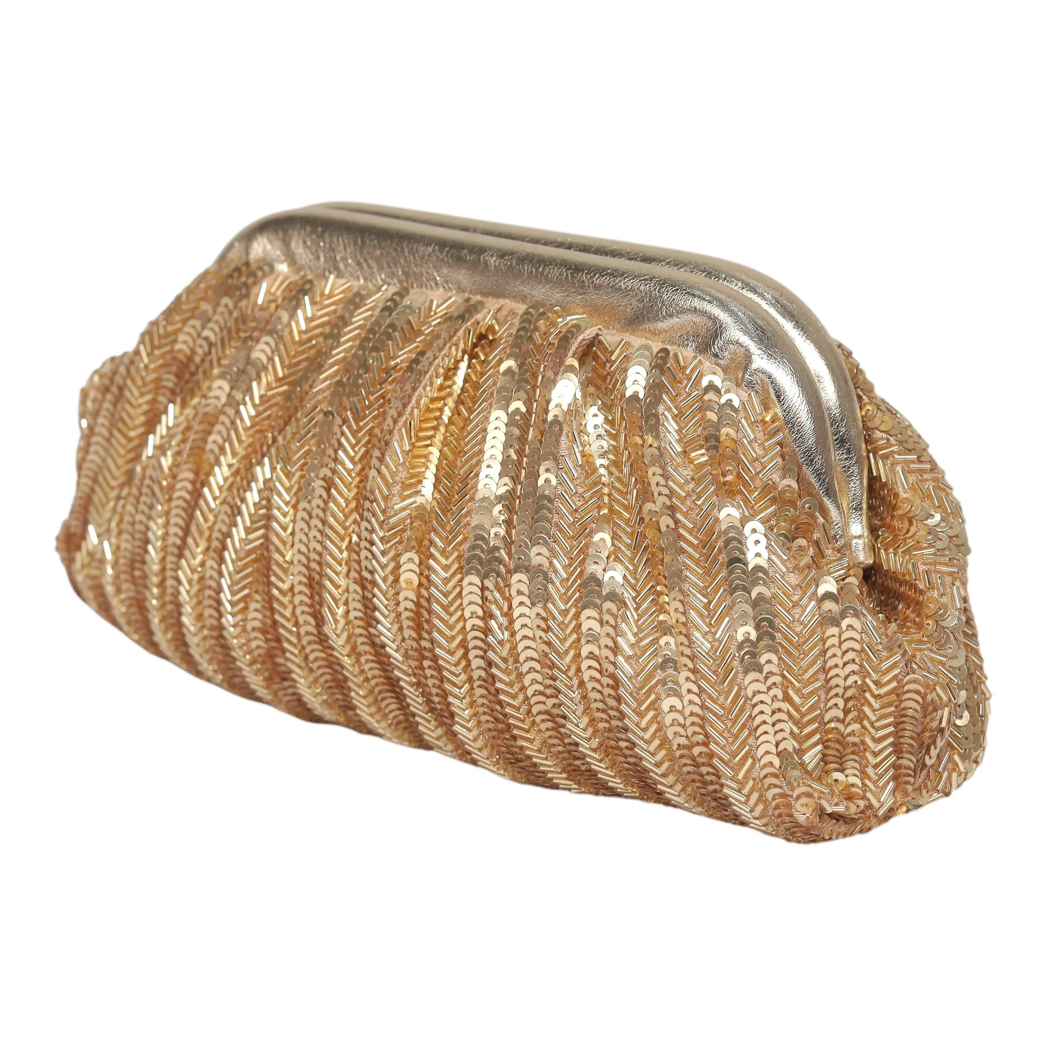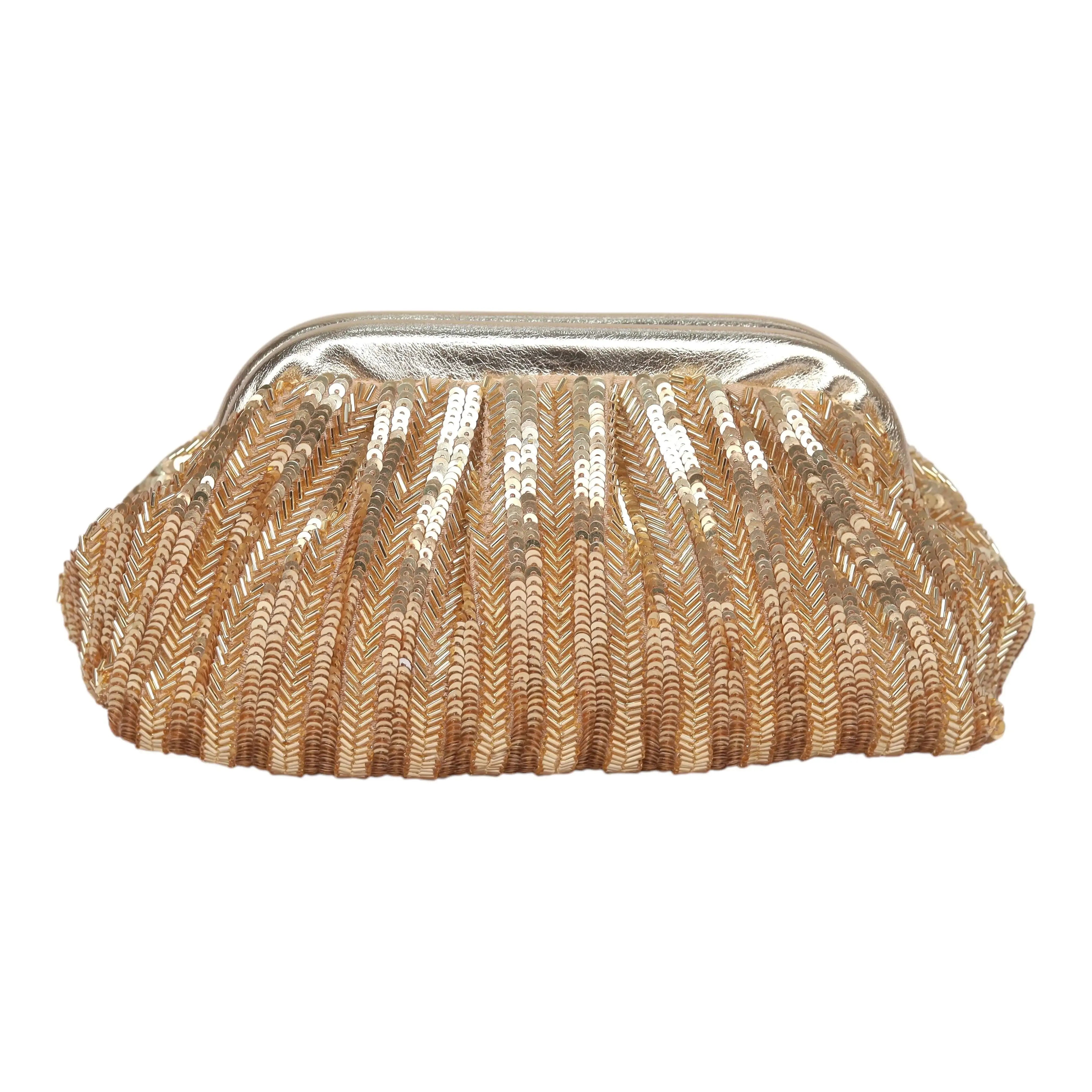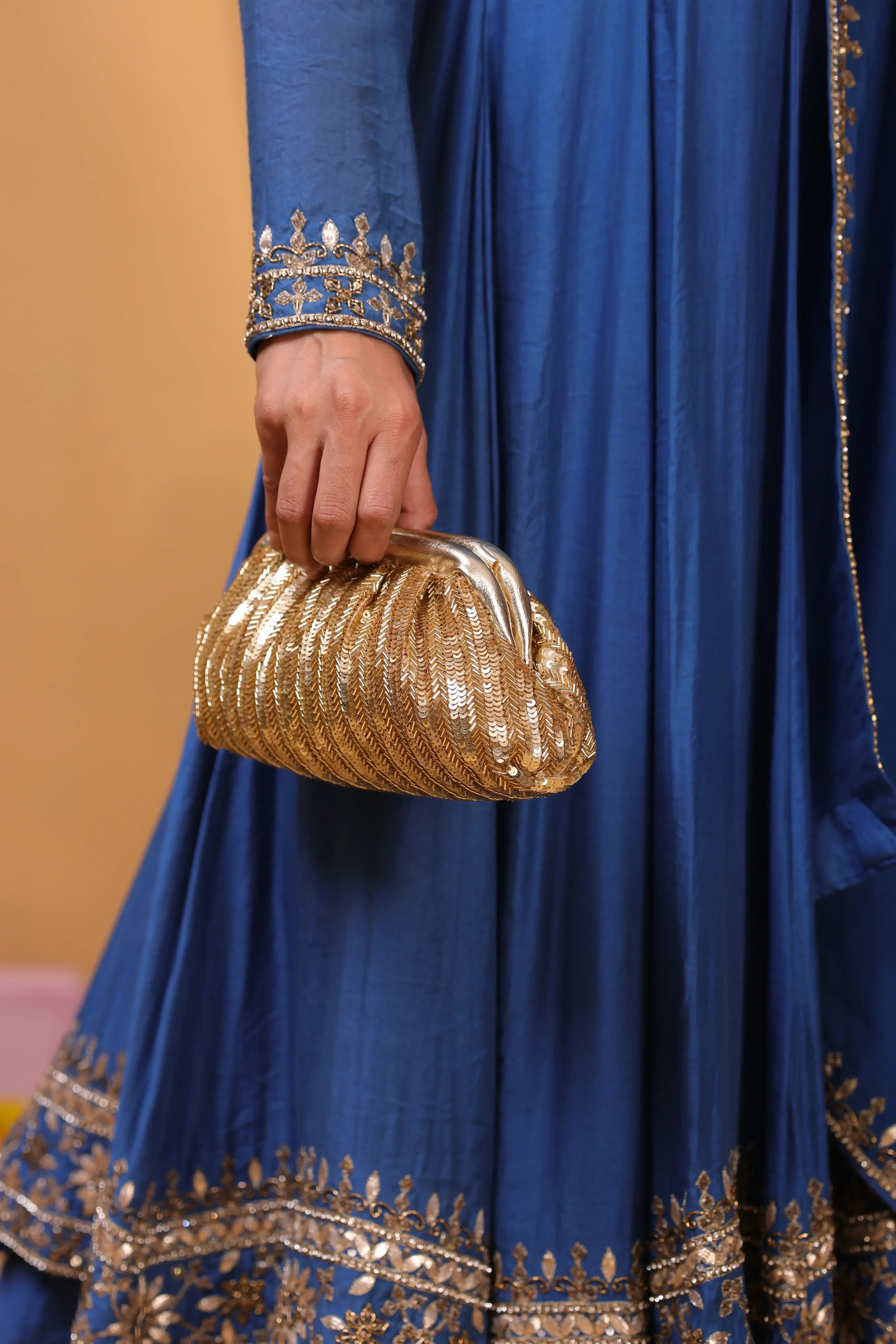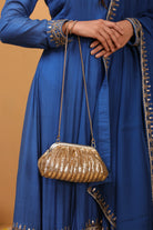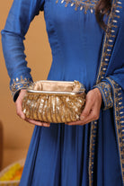 Elevate your look with our exquisite Rhea gold Vintage Purse. Crafted in golden sequence, this purse features intricate sequence and cut dana work, adding a touch of timeless elegance. The beautifully detailed embroidery showcases a fine blend of craftsmanship, making it a standout accessory for any occasion. Spacious yet stylish, it is perfect for carrying your essentials while complementing your attire. Whether for weddings, parties, or special celebrations, this potli bag is a must-have addition to your accessory collection.
